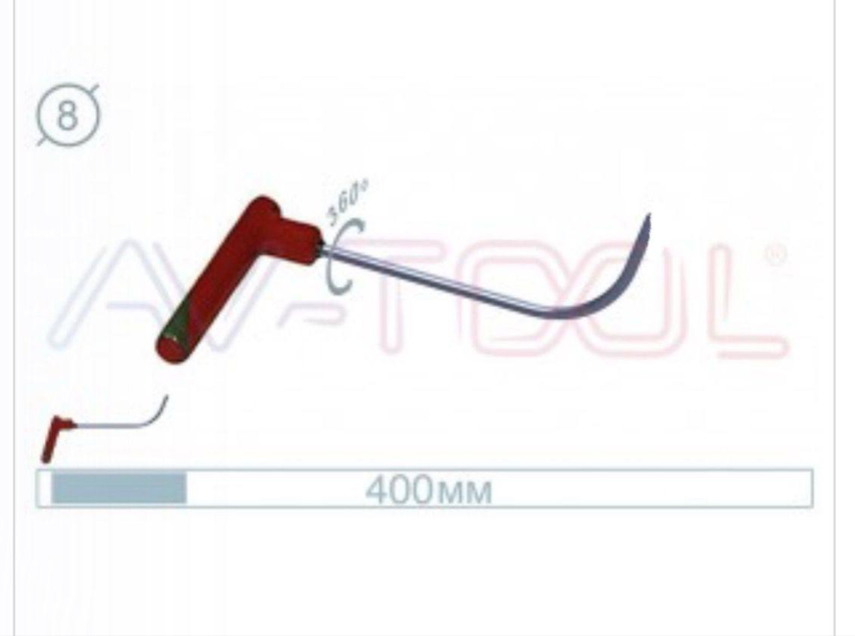 Крючок дверной, длина 400 мм. Диаметр: 8 мм. Окончание заострённое ножевидное. Идеально подходит для подрезки герметика в зоне ремонта и для точной выверенной работы. Рукоятка поворотная асимметричная. Производитель: AV-TOOL.