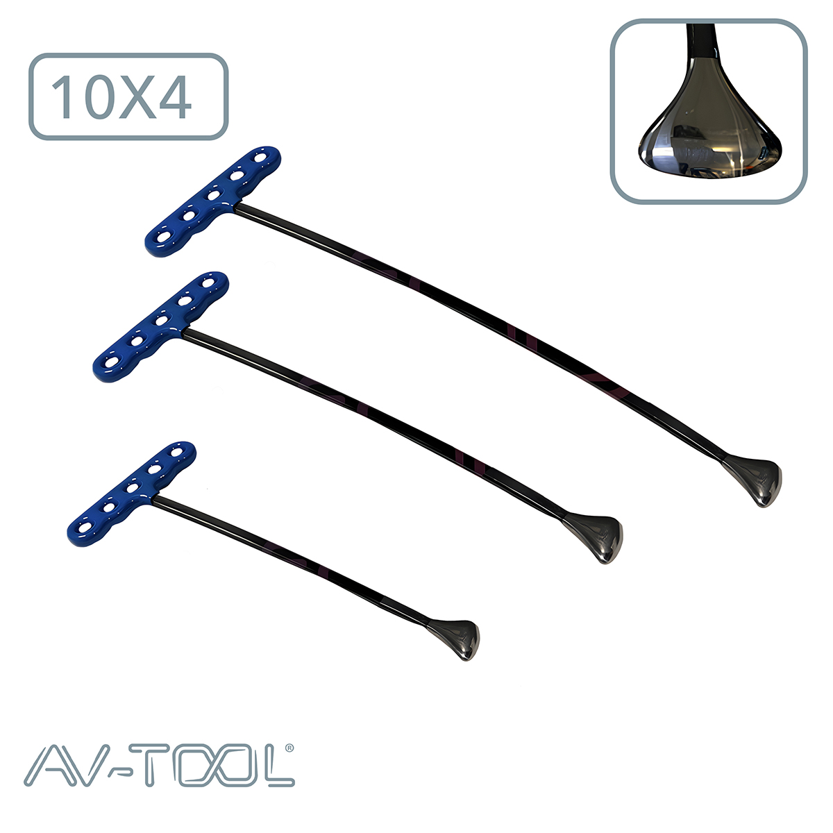 Комплект из 3 крючков. Длина 600, 400, 200 мм. Этот инструмент имеет прямоугольное сечение (5х10мм) и окончание сферической формы для работы с потянутыми и другими типами вмятин методом перекатывания и классическим методом, в полостях и труднодоступных местах. Быстро и эффективно поднимает дно растянутых вмятин. Производитель: PDR EXPERT, Россия.