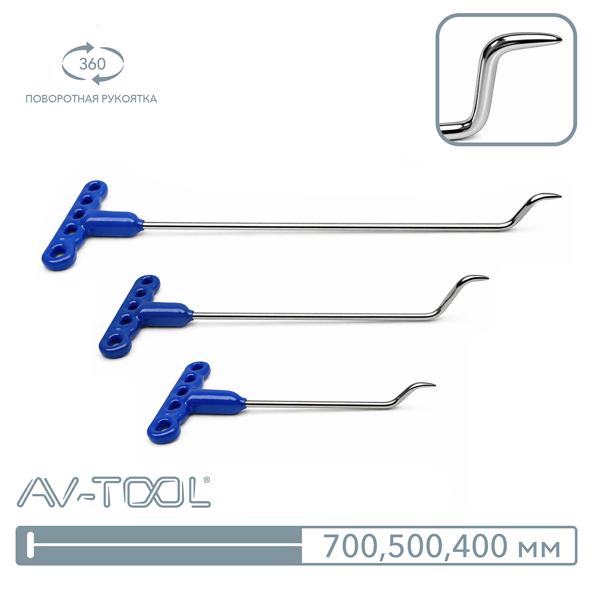 Крючки для потянутых вмятин длина: 700, 500, 400 мм, диаметр: 10, 8, 6 мм. Рукоятка поворотная.