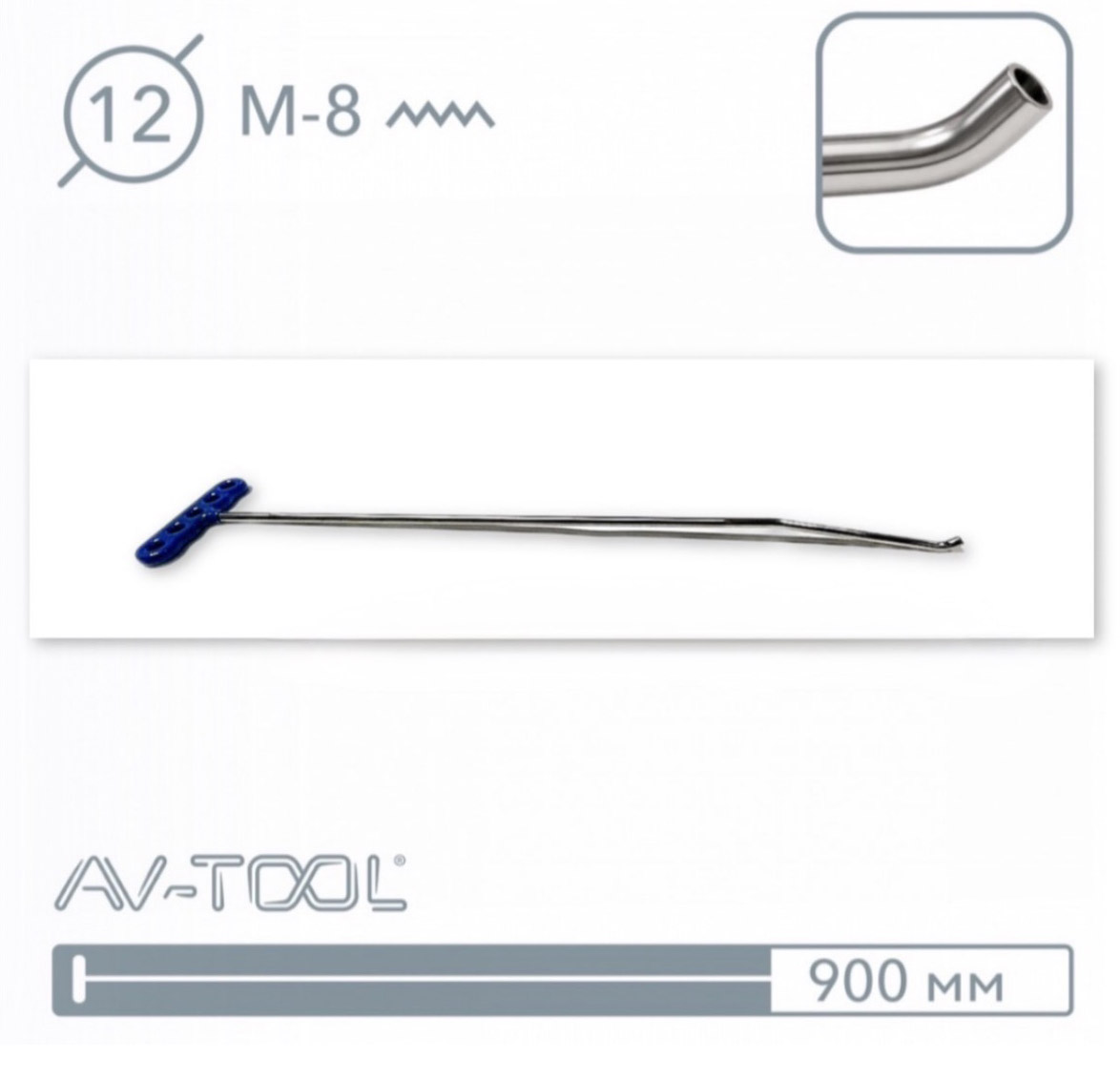 Крючок под сменную насадку. Резьба М8, длина 700 мм, диаметр 12 мм, первый загиб - 10 градусов, второй загиб - 45 градусов. Предназначен для глубокого захода внутрь деталей. Эффективен для работы с крышками багажников, дверьми, капотами и т.д. Производитель: PDR EXPERT, Россия.